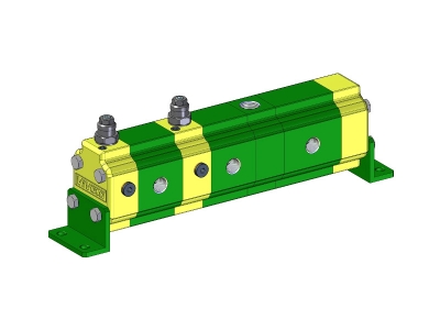 Vivoil's gear flow divider with independent phase correction and anticavitation valves for each element, equipped with a hydraulic motor. It's a motorized version of the RV-1V model.